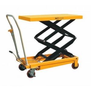 Ergonomically designed table truck features handy hydraulic foot pump to elevate formed-edge platform, reducing strain and fatigue, used for lifting, transporting, positioning,assembling,stacking and unstacking. Easy-to-operate brake keeps unit stationary while loading and unloading, while the lowering valve provides precise lowering.
