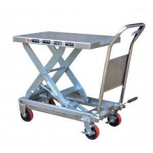 500kg capacity and a 89cm lift height, the table trucks have a stainless steel SUS304 structure with galvanised pump and cylinder. Table top size is 815x500mm.