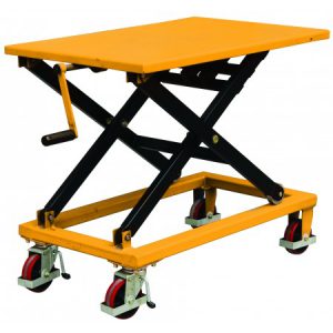 A screw type lift table rises and lowers through turning the handle. This model has a 300kg capacity, 950x600mm table area and can lift the load between 440 and 1000mm.
