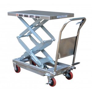 350kg capacity and a 1.3 metre lift height, the table trucks have a stainless steel SUS304 structure with galvanised pump and cylinder. Table top size is 910x500mm.